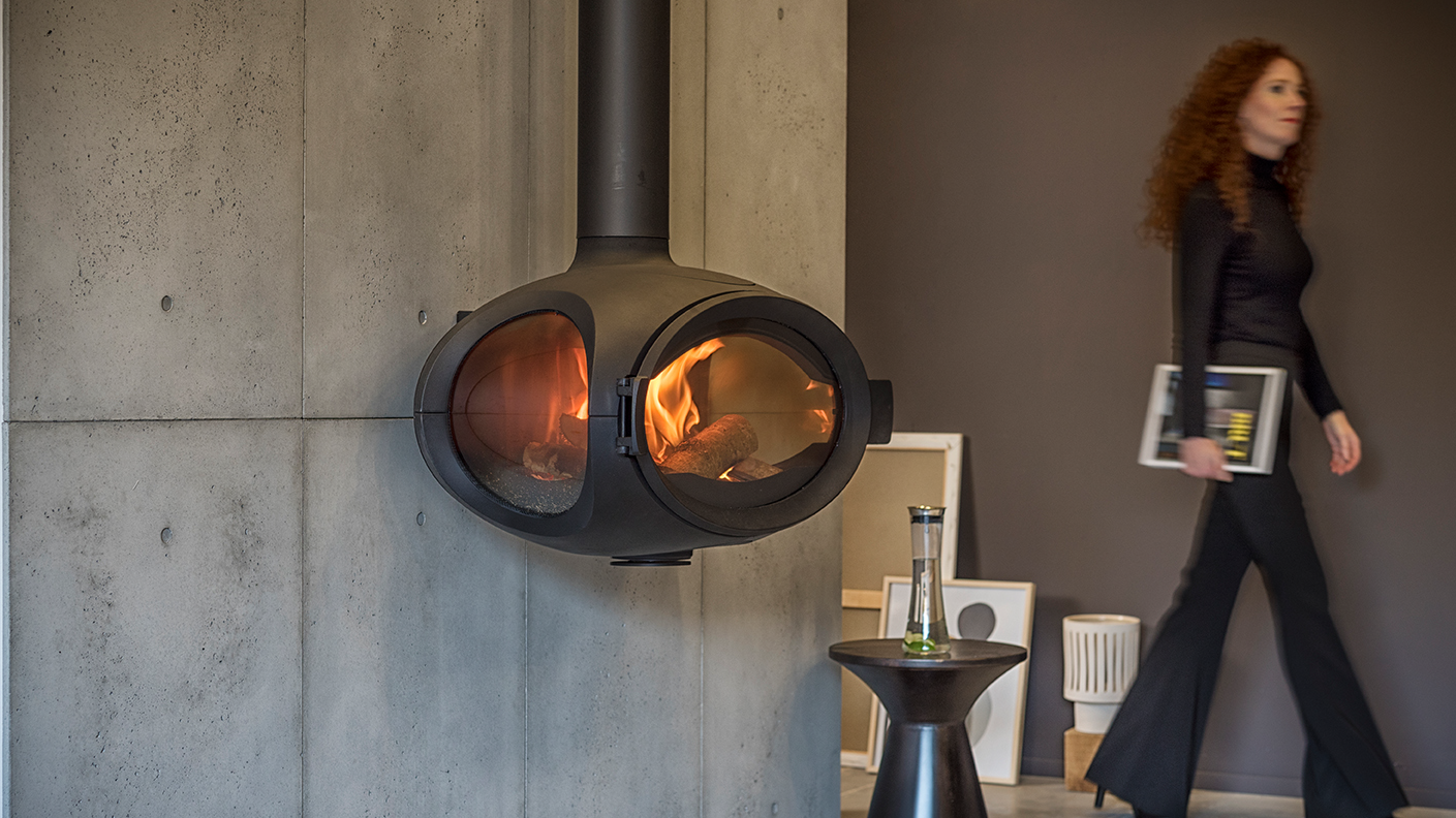 A salamandra a lenha Biojaq WD Mata é uma salamandra suspensa, fixa à parede, com um design completamente diferente do habitual.