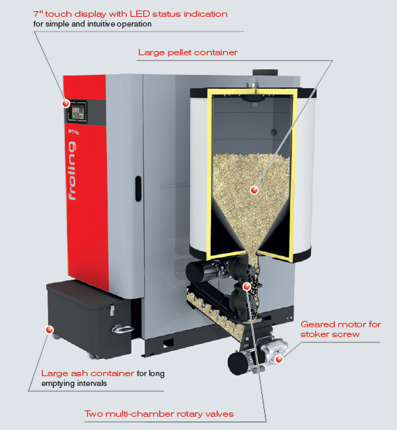 A Froling também oferece uma vasta gama de sistemas de alimentação de combustível para praticamente todos os seus requisitos. O consumo de energia óptimo é assegurado pelo sistema bem estruturado de engenharia, super silenciosa e de alto rendimento. Isso significa que a Froling T4 pode oferecer, aquecimento amigo do ambiente e confiável!
