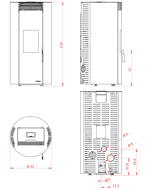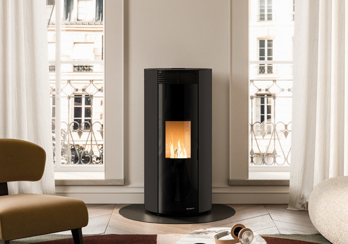 Salamandra a pellets hermética e elegante, com design arredondado e saída de fumos traseira.