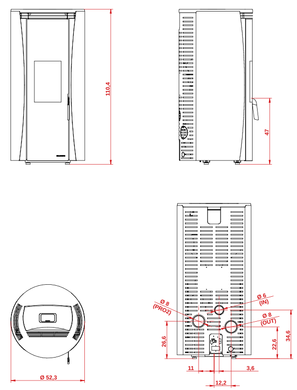 • Kit Pro 2: possibilidade de adicionar kit de ventilação para canalização de ar quente para outras divisões (Ø 8 cm)