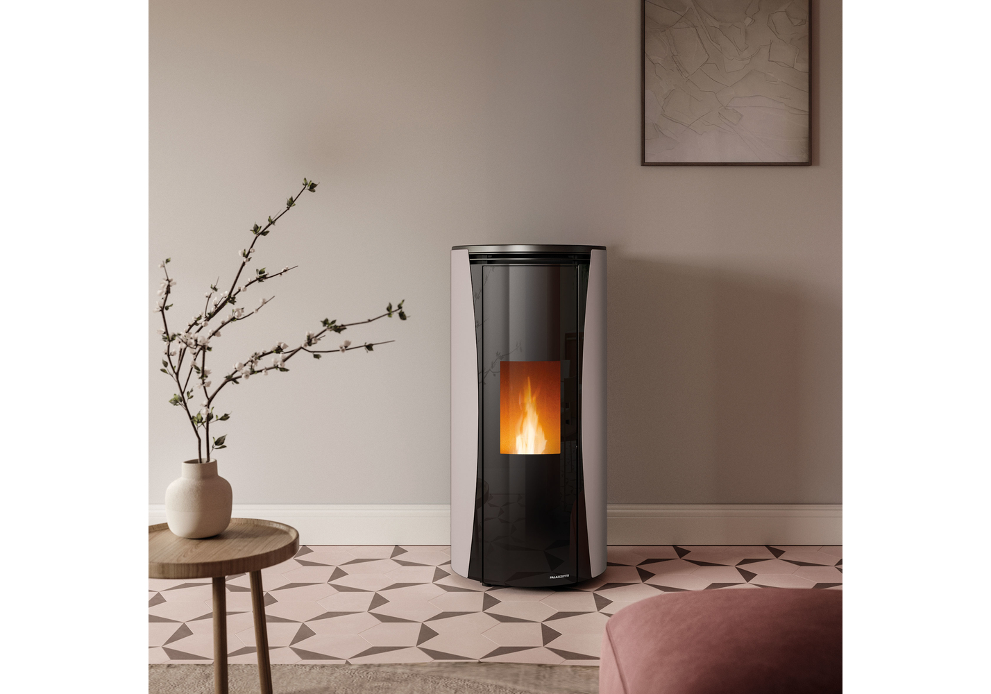 A salamandra a pellets hermética e elegante, com design arredondado.